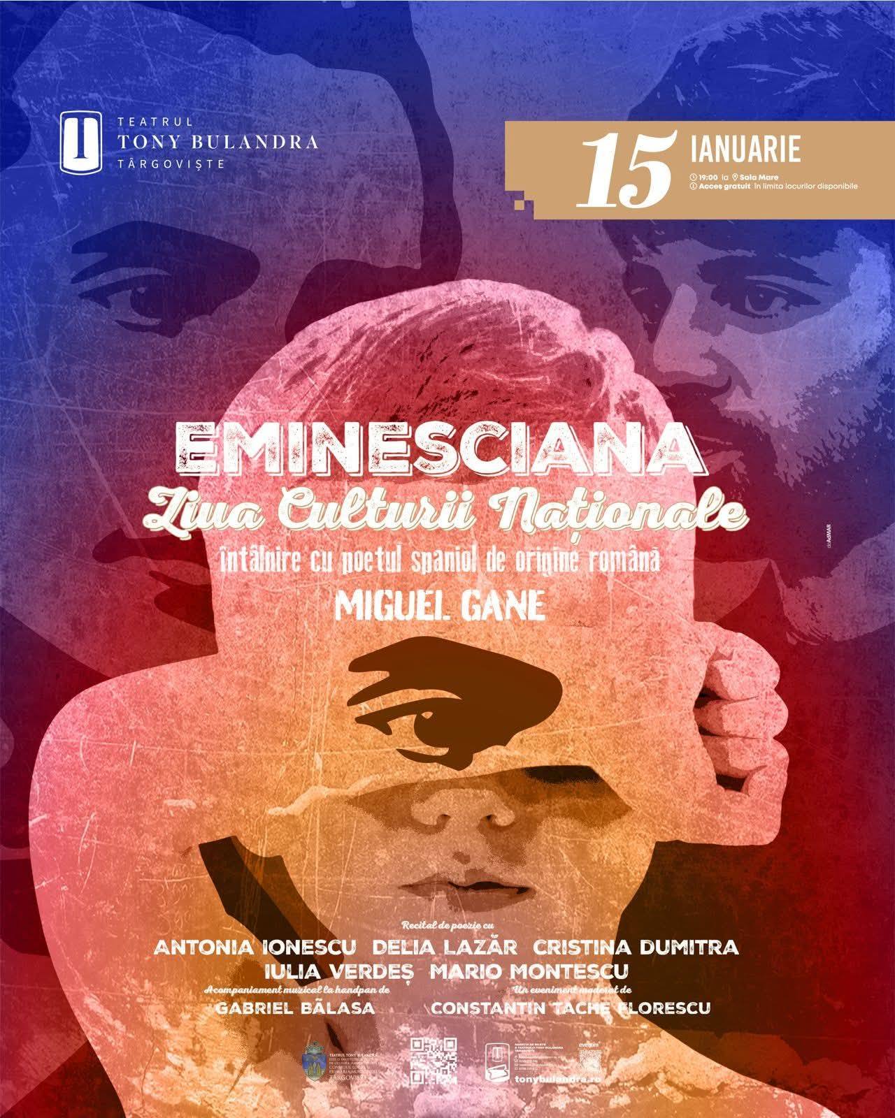 Teatrul Tony Bulandra din Târgoviște organizează, joi 15 ianuarie la ora 19.00, un spectacol special dedicat Zilei Culturii Naționale. Evenimentul intitulat „Eminesciana” aduce în prim-plan poezia, având ca protagonist pe poetul Miguel Gane, care va recita alături de actori ai teatrului. Potrivit %source%, acest spectacol inedit redă magia metaforei poetice în limba română.