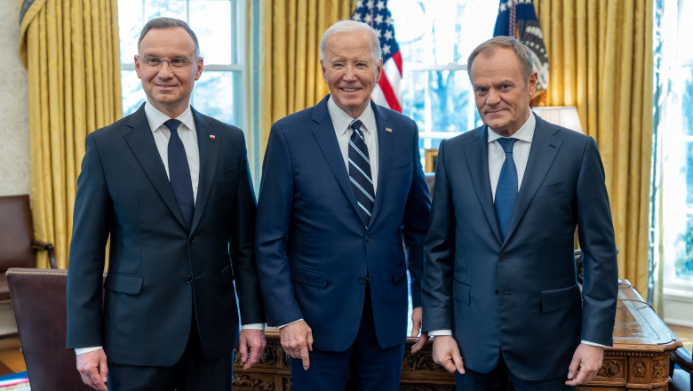 Președintele Poloniei, Andrzej Duda, și premierul guvernului Poloniei, Donald Tusk, au mers împreună la Washington pentru a discuta cu președintele Biden și a face lobby pentru susținerea Ucrainei.