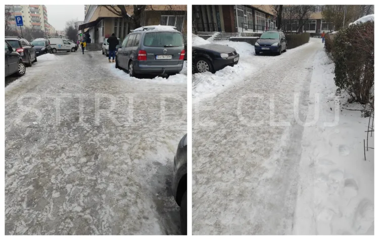 Pietonii din mai multe zone ale cartierului Mănăștur se confruntă cu situații periculoase, fiind claxonați și presați de șoferi să meargă pe trotuare acoperite cu gheață. Un localnic a transmis pentru ȘTIRI DE CLUJ: „Mașinile după ce că vin cu viteză ne mai și claxonează și ne fac semn să urcăm pe trotuar. Unde nene că noi nu putem circula pe trotuar! Hai tu și vezi dacă poți să umbli pe gheața aceea”.