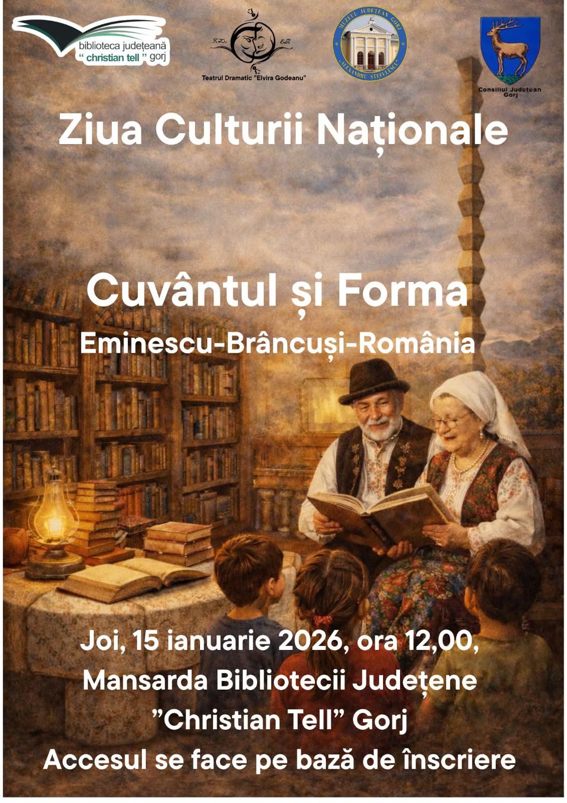 Joi, 15 ianuarie 2026, în intervalul orar 12:00–14:00, în mansarda bibliotecii, va avea loc manifestarea „Cuvântul și Forma. Eminescu – Brâncuși – România”. Aceasta include amenajarea căsuței cu povești „În bătătura bunicilor”, unde copiii vor redescoperi tradițiile și poveștile din copilăria bunicilor lor.